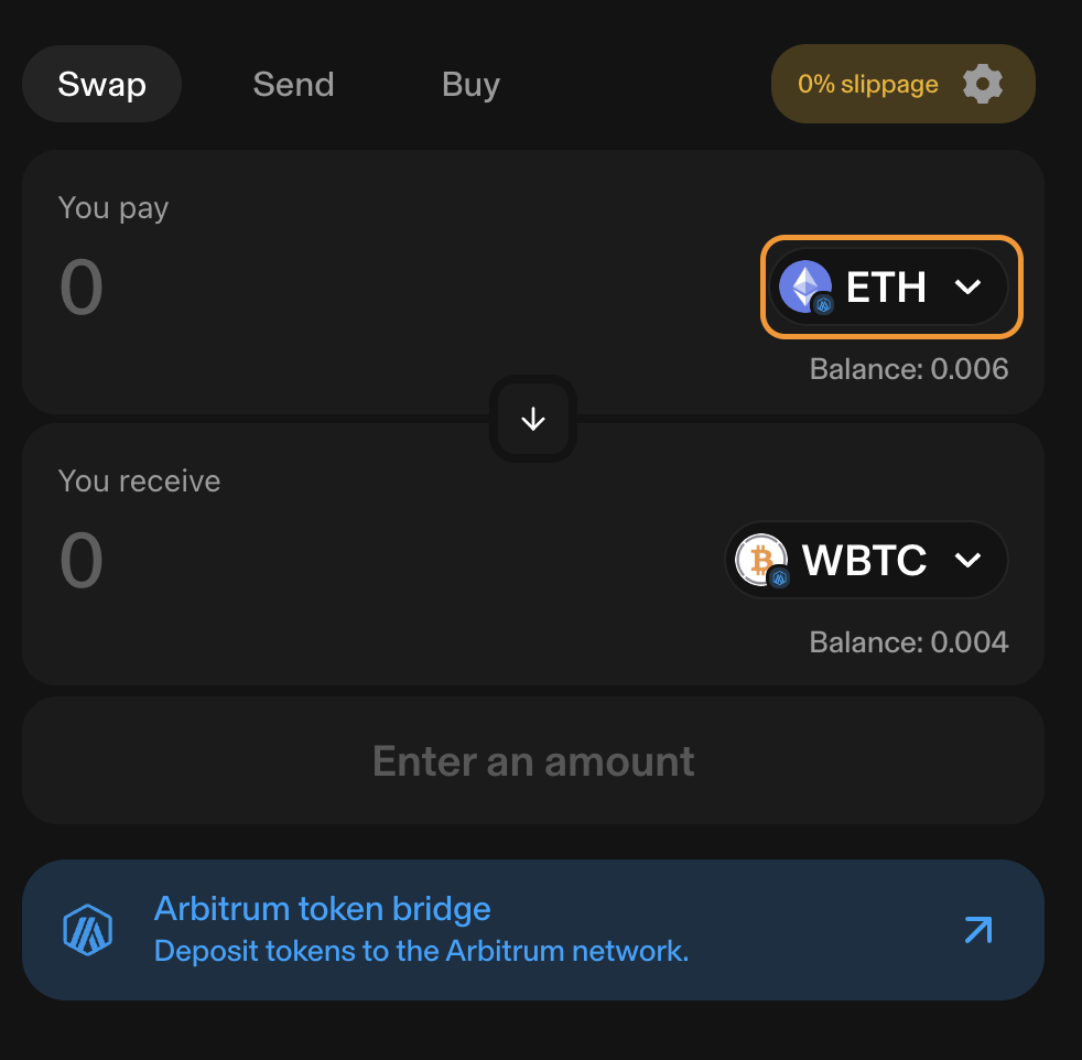 You may choose any token (ETH in our example) and swap it for WBTC on Arbitrum, you can then use WBTC with dVOL&#x20;
